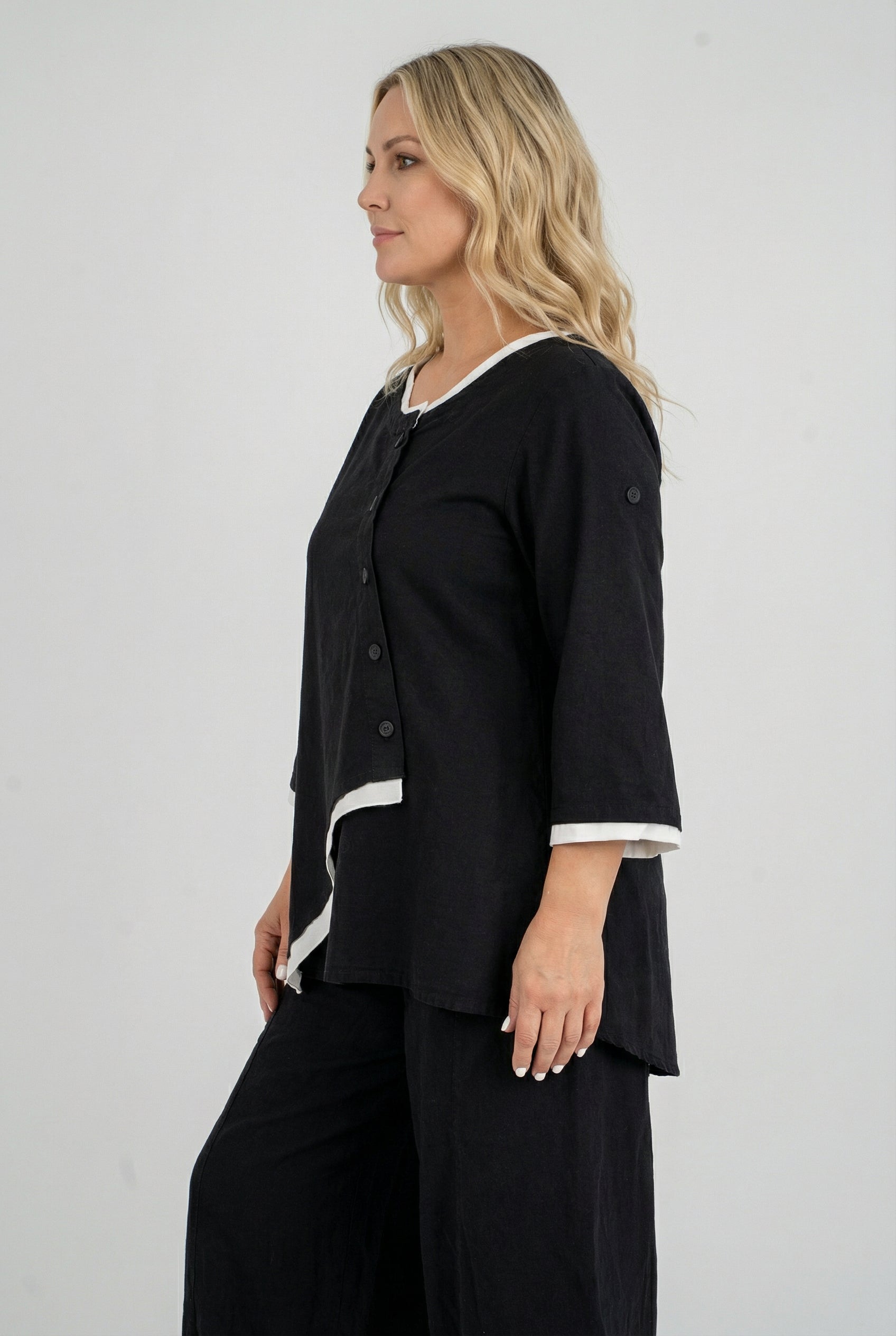 • Detaljer: sned knappslå, rund halsringning med kontrastkant, 3/4-ärmar med uppslag & fixeringsrem, kontrasterande offwhite-kanter vid fåll och ärmar